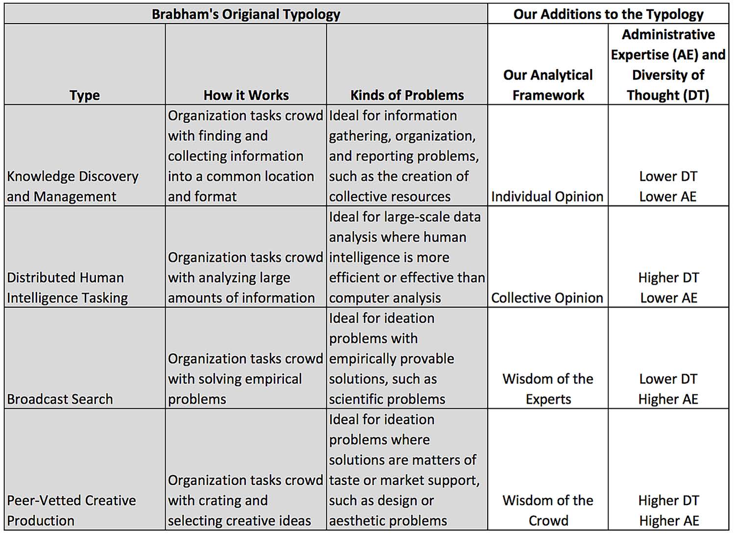 They further flesh it out through this typology. You can see under the column labeled “Our Analytical Framework” how this second figure corresponds to the first. What is SO helpful about this second figure is that it gives a quick and dirty guide to ways in which an organization can crowdsource and some of the issues you should consider.