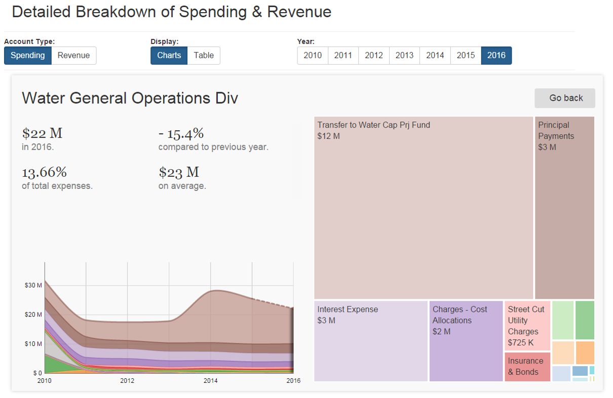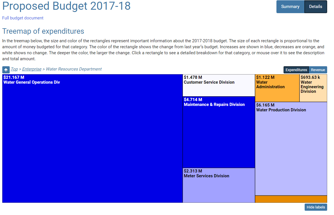 What I like about it is that it presents the different areas of expenditures and visually presents them based on their size. This is more effective in helping people understand the scope of expenditures and the differences in the level of program spending. It also allows the user to click on the box and dive deeper into the spending in that area. For example, above is a visualization two clicks in from the full budget. I first clicked enterprise and then water. This is a simple way to present some of this information in a digestible way. One thing that may have made it even better would be having definitions involved for those residents that do not know what enterprises are, for example. You could also link to the website of these departments or that section of the budget.